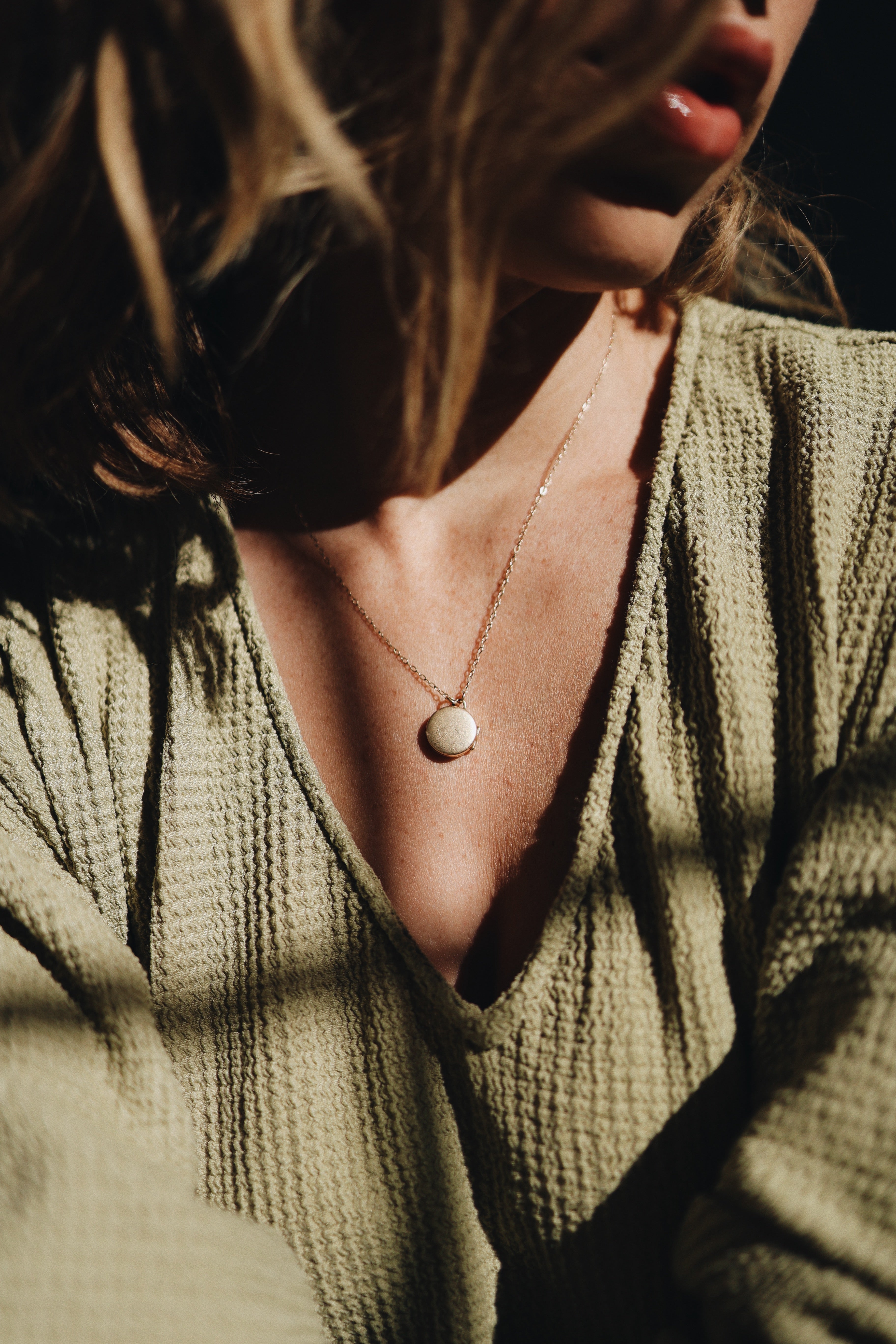 I'm the pickiest ever when it comes to jewelry, so I've thought through every single thing. The locket is fixed to the chain, so the clasp will never fall forward. Adjustable chain length so you can wear it short or long for different shirt necklines. The standard locket has a matte texture on one side, and mirror shiny finish on the other - so you can wear it either direction to change up the look. The window locket can be worn with the photos facing out or toward your chest - beautiful either direction. Actually handmade, and you'll be able to feel it in all the perfect little details.